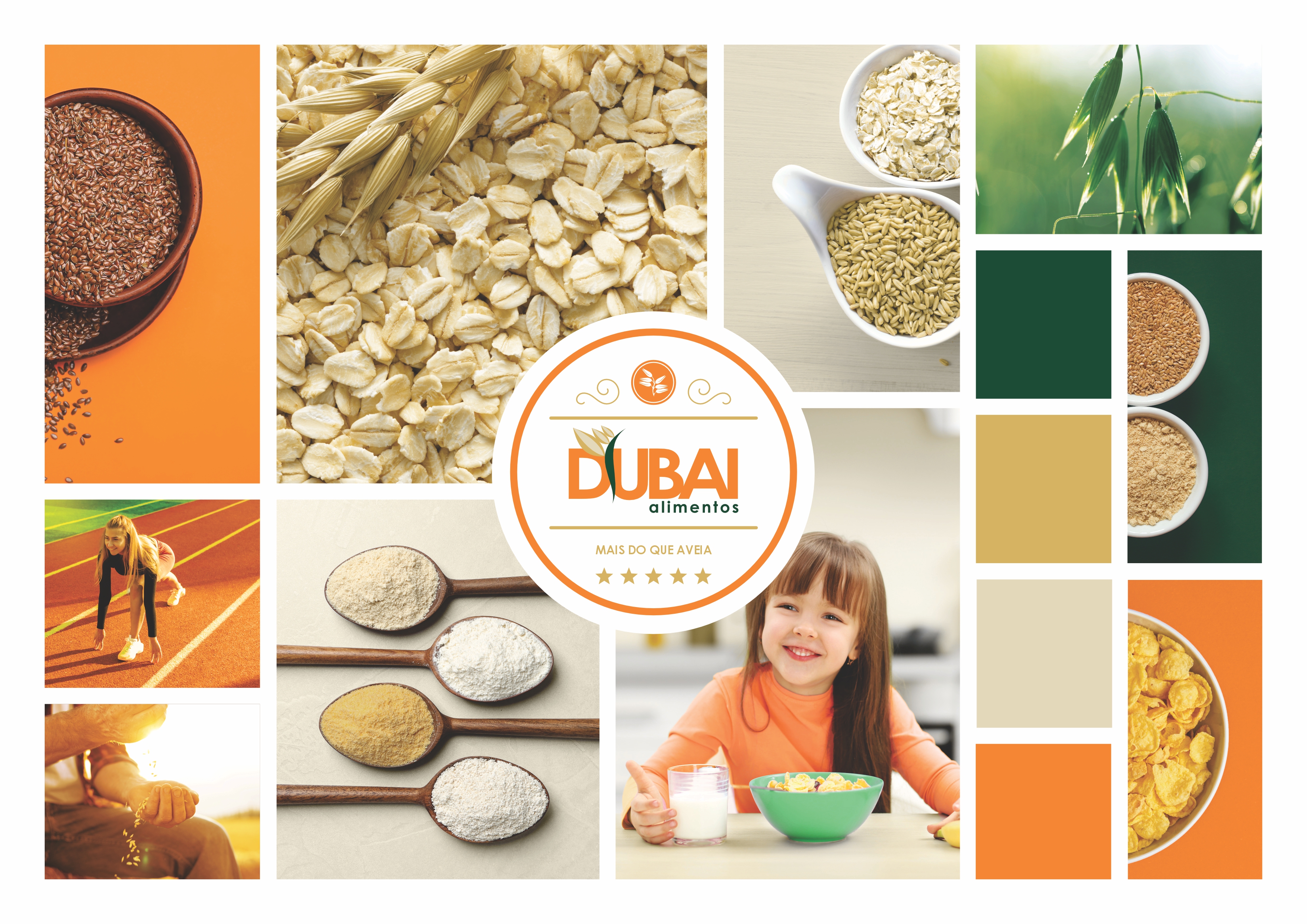 O moodboard da Dubai Alimentos destaca a trajetória dos alimentos desde o campo até a mesa, ressaltando a seleção de matéria-prima de qualidade e a transformação em produtos que promovem saúde e bem-estar. ​